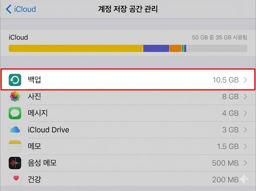 경로: [설정] > [내 이름] > [iCloud] > [계정 저장 공간 관리] > [백업]