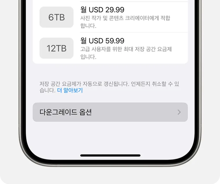 경로: [설정] > [내 이름] > [iCloud] > [계정 저장 공간 관리] > [저장 공간 요금제 변경] > [다운그레이드 옵션]