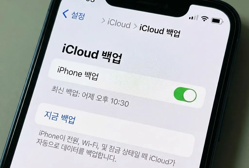 2. iCloud 백업 (과거 시점 저장) iCloud 백업은 아이폰 전체를 과거의 어느 시점으로 통째로 저장해둔 파일이에요.