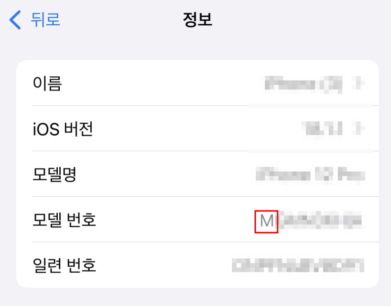 가장 중요한 모델명/일련번호 확인 방법입니다. 아이폰이 새 제품인지, 리퍼비시 제품인지, 서비스 교체품인지는 모델 번호의 첫 글자만 보면 알 수 있어요.